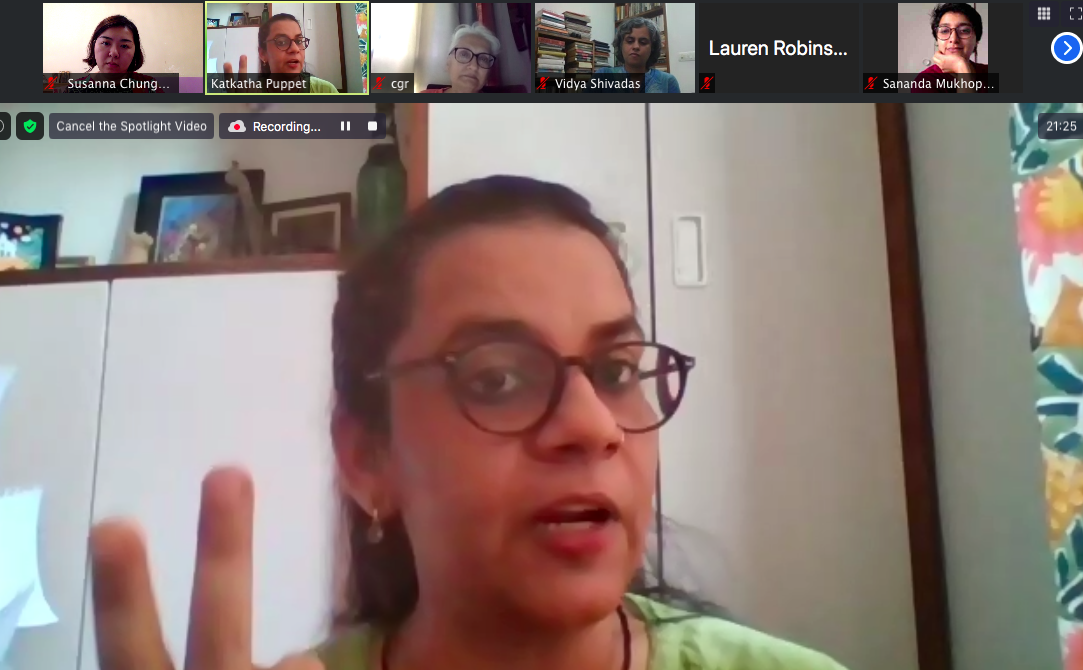 Anurupa spoke about her journey through Kathkatha, A Puppet Theatre, where her primary concern has been working to develop pedagogies through generational learning within communities. She took participants on a walkthrough of her work, explaining how Kathkatha started from the need to reinvent the idea of what ‘publics’ are. She continued along an earlier tangent of collaborative learning, learning-as-play, and brought out ways of dealing with boredom, disbelief and distraction. Her presentation was followed by an exercise that she had prepared, asking participants to use simple props such as paper and found objects to challenge the flatness of the digital platform.